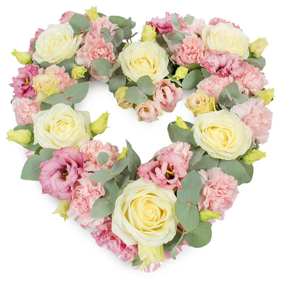 Convey your deepest emotions with our heartwarming tribute bouquet. This beautiful arrangement features white roses, pink carnations, pink lisianthus, and fresh eucalyptus, meticulously arranged to symbolize love and remembrance.