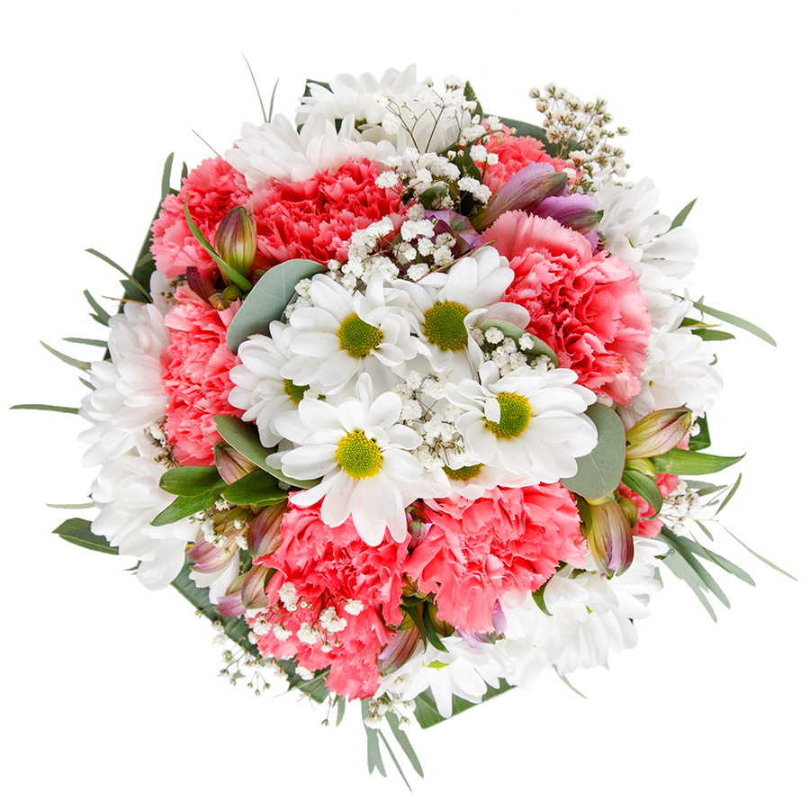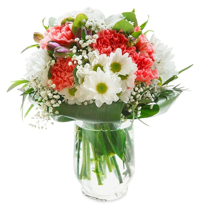 Delight someone special with our unique and beautiful bouquet, featuring a stunning mix of snow-white chrysanthemums, airy gypsophila, and charming light pink carnations. The arrangement is beautifully complemented by vibrant aspidistra leaves, creating a perfect balance of color and texture.